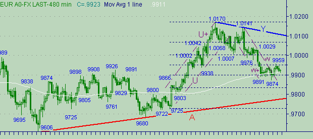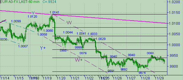 Параметры последнего торгового дня: Open=0.9303, High=0.9959, Low=0.9890, Close= 0.9943. На рис. 1, 2 и 3 приведены графики с периодами день, 480 мин., 60 мин. Коррекционное движение от down-тренда 1.0141(19/11/02)-0.9874(27/11/02) продолжается. Первая восходящая ветка составила 85п. (0.9874-0.9959). Нисходящее движение с началом от 0.9959(28/11/02) состоит: первая ветка 0.9959-0.9921 длиной 38п.; вторая ветка началась от 0.9946 и если она будет ровна длине первой ветки, то ожидаемая цель для неё будет на уровне 0.9908. Можно рассмотреть ещё более мелкое движение с началом от 0.9946: первая ветка 0.9946-0.9918 длиной 28п.; вторая началась от 0.9937 и если она будет ровна длине первой, то получаем цель для неё на 0.9909. Получается, что на 0.9910-0.9905 расположен приметный с технической точки зрения уровень. Тогда рассмотрим далее возможный сценарий, если от 0.9910 начнется вторая восходящая коррекционная ветка и она будет ровна длине первой ветки (0.9874-0.9959), тогда мы получаем в качестве ожидаемой цели уровень 0.9995.Для формирования серьезного движения вниз по графику необходимо закрытие дневной свечи ниже 0.9900. Пока это не случилось рассматриваем в качестве рабочего интервала интервал цен 0.9900-1.0000.