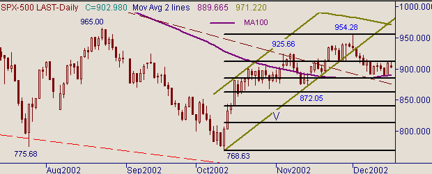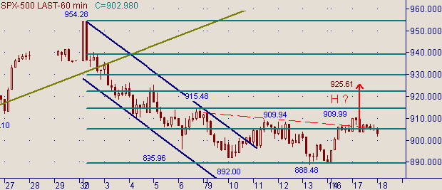 Параметры последнего торгового дня фондового рынка: Open=905.17, High=911.22, Low=901.74, Close= 902.98. На рис. 1, 2 и 3 приведены графики с периодами 15 мин., 60 мин. и деньКак мы видим на рис. 2 разворотная фигура двойное дно оказалась "Собакой Баскервилей" - отрабатываться фигура не собирается. Сейчас рынок находится между дневным