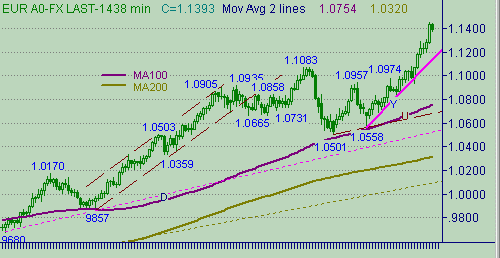 Евро/доллар пытаются пробиться и закрепиться выше уровня 1.1400. На графиках с периодами месяц или неделя этот уровень примечателен тем, что здесь сходятся два уровня Фибоначчи: 1.1400 соответствует 50% коррекции от снижения курса 1.4575(сент. 1992г.)-0.8225(окт. 2000г.)