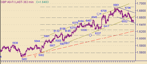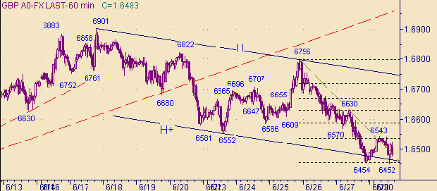 O на рис. 1. Нисходящее движение приостановилось на уровень 1.6455. Сегодняшний минимум составил 1.6452. Напомним, что равенство длин нисходящих веток в канале H-H+ на рис. 3 находится на уровне 1.6447. Сегодняшний минимум протестировал уровень коррекции 23.6% от снижения курса 1.6796(25/06/03)-1.6454(27/06/03) − см. на рис. 3. В случае выхода курса выше 1.6543 образуется фигура Двойное Дно, с отработкой до 1.6630.Опускание курса ниже 1.6400 переводит интерес медведей к уровням вблизи 1.6230. На сегодня ключевая область сопротивления 1.6600-1.6615.