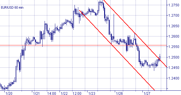 Евро формирует симметричный треугольник на дневном графике − как правило, фигуру продолжения. На часовом графики пробит нисходящий канал, однако свеча пока не закрылась выше границы канала. Ширина канала − 170 пунктов, значит у быков есть шанс поднять цены до отметки 1.2650/60. Это вполне укладывается в сценарий несколькодневной консолидации в рамках симметричного треугольника.