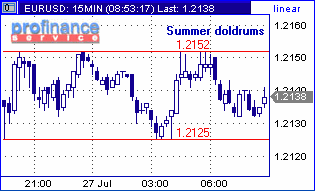 Пара евро/доллар провела довольно спокойный азиатский сеанс, поскольку болезнь "летнего плохого настроения" продолжается. К моменту открытия фондовой биржи в Токио пара дрейфовала в нисходящем направлении. Протестировав минимумы сессии на 1.2125, евро попытался укрепить свои позиции, но предложения американских инвестиционных банков не позволили, не смотря на неоднократные попытки, преодолеть уровень 1.2150. Офера отмечены дилерами на 1.2185 и 1.2215. Биды стоят на 1.2115 и ниже на 1.2090