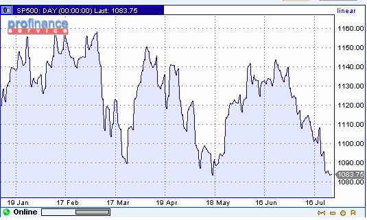В понедельник индекс широкого рынка S&P 500 достиг минимального значения с начала года. Очередным поводом для сброса бумаг послужили худшие, чем ожидалось, прогнозы компаний на оставшуюся часть года. Так, Andrew Corp., производителя оборудования для беспроводной телефонной связи, прогнозирует в четвертом квартале прибыли на уровне 13 центов на акцию, хотя аналитики ожидают 16 центов на акцию. Акции Andrew упали на $3.38 - до $11.39. Производитель мяса Tyson Foods Inc. ожидает, что прибыль в текущем квартале понизится по сравнению с аналогичным периодом прошлого года из-за ветеринарных запретов на экспорт мяса. Акции Tyson подешевели на $1.47 - до $18.48. "Прибыли ряда компаний оказались хуже, чем прогнозировали эксперты, -говорит менеджер Fort Washington Investment Advisors Чарльз Стутенрот. -Беспокойство по поводу выборов и опасения террористических актов негативно отражаются на фондовом рынке США". По мнению Питера Маккорри, главного трейдера Keefe Bruyette & Woods Inc. в Нью-Йорке, опасения американских трейдеров вызывает возможность терактов в связи со съездами политических партий, а также в ходе Олимпиады. Акции фармацевтических компаний также снизились. Бумаги Pfizer упали на 56 центов - до $31.74. Конкурирующая Merck & Co. выпустила новый препарат "Виторин", понижающий уровень холестерина в крови, который является аналогом лекарства "Липитор", выпускаемого Pfizer. Новый препарат был одобрен регулирующими органами. Аналитик Friedman, Billings, Ramsey & Co. Дэвид Московитс понизил рекомендации к акциям Pfizer до "на уровне рынка" с "выше рынка", отметив рост конкуренции.