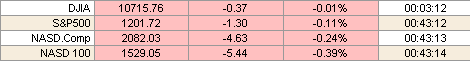 Внутри уже опубликованного пакета отчетов следует отметить релиз от изготовителя игрушек Hasbro Inc. Доходы компании не соответствовали целевым адресатам Wall Street, что вызвало падение стоимости акций на 1.96% до 20.00. Страховая компания WellPoint Inc. также представила неутешительные данные по доходам в прошедшем квартале, ссылаясь на подскочившие медицинские затраты. Акции WellPoint упали на 3.23% до 120.85. Компания Clorox Co. представила сильный квартальный отчет, результаты которого оказались выше прогнозов аналитиков Wall Street. Шестикратное увеличение прибыли вдохновило инвесторов, и вызвало рост акций компании на 0.99% до 59.18. Всемирно известный изготовитель лекарств Pfizer Inc., в преддверии заседания американского управления по контролю за лекарствами, выросли на 2.77% до 24.90.