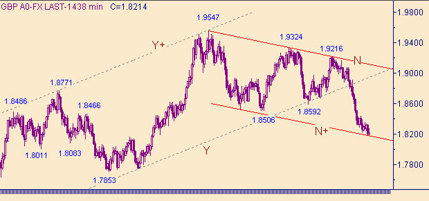 Можно сказать, что вчера курс фунт/доллар тюкнули линию N+ на рис. 1. Напомним, что равенство длин двух нисходящих веток в этом канале (первая ветка - 1.9547(16/12/04)-1.8506(10/2/05); вторая началась от 1.9324(8/03/05)) находится на уровне 1.8283, который рынок уже преодолел. Вот теперь на очереди очередной рубеж - линия N+ на рис. 1. Ниже линии N+ находится следующий важный, для этого нисходящего движения, уровень 1.7860. Для самой второй ветки (down-движение с началом от 1.9324(8/03/05)) технические целевые уровни имеем вблизи ценовых значений 1.8140, 1.8035, 1.7860.