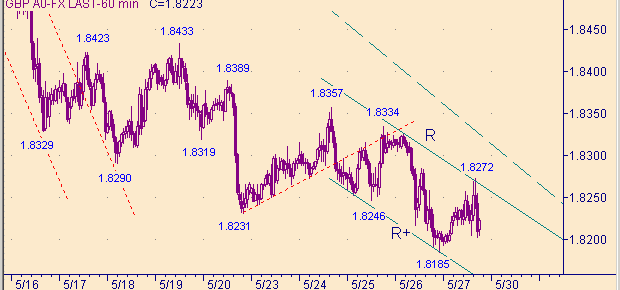 Текущую ситуацию определяем как процесс формирования коррекционной формации от снижения курса во втором нисходящем движении в канале R-R+ на рис. 3. В этом канале первое нисходящее поддвижение образовано снижением 1.8357(24/05/05)-1.8246(25/05/05), а второе - 1.8334(25/05/05)-1.8185(26/05/05). Предполагаем, что от сегодняшнего максимума, равного 1.8272, началась третья нисходящая ветка в канале R-R+. Для этого нисходящего движения имеем следующие технические целевые уровни и интервалы: 1.8120-1.8135, 1.8065-1.8080, 1.7890-1.7910.