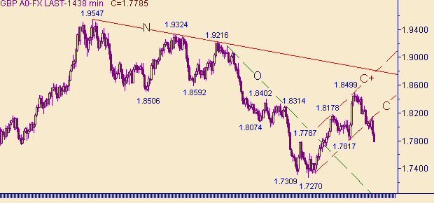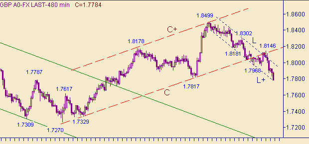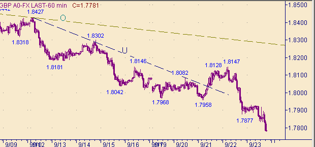 Предполагаем, что сейчас формируется третья нисходящая ветка в down-движении с началом от 1.8427(12/09/05): первая ветка - 1.8427(12/09/05)-1.8181(13/09/05); вторая - 1.8302(14/09/05)-1.7958(21/09/05); третья началась от 1.8147(22/09/05). Расписывать далее подробности проблем не будем. При рассмотрении пары фунт/доллар с целью постановки позиции встречаем те же проблемы, что и для пары евро/доллар. Здесь так же требуется пересмотреть расклад текущего движения в связи с выходом курса ниже 1.7800 и выбора новой модели, удобной для работы.