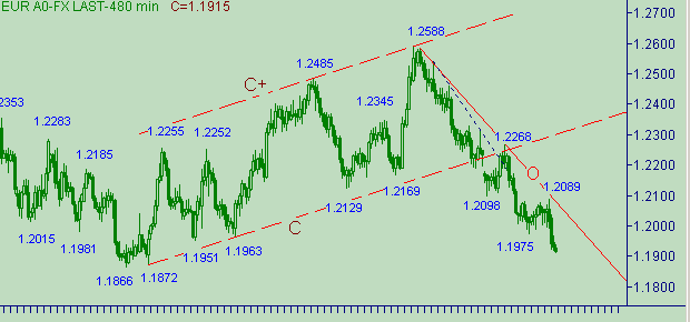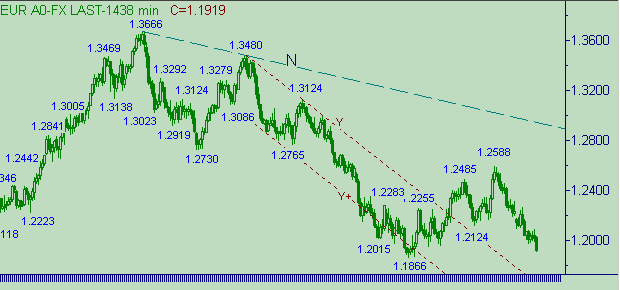 Евро/доллар модели коррекции предпочли модель продолжения нисходящего движения с началом от 1.2268(22/09/05) - см. на рис. 3. Другой вариант толкования down-движения - формирование третьей нисходящей ветки в движении вдоль линии O на рис. 2. На рис. 2 видим, что максимум последнего торгового дня, равный 1.2089, почти коснулся линии O. Для нисходящего движения перечень потенциальных технических уровней и интервалов: 1.1895-1.1910, 1.1865, 1.1780-1.1800, 1.1685, 1.1595-1.1608. Вблизи этих значений цен ожидаем или окончания нисходящего движения вдоль линии O на рис. 2 или формирования локальных донышек.