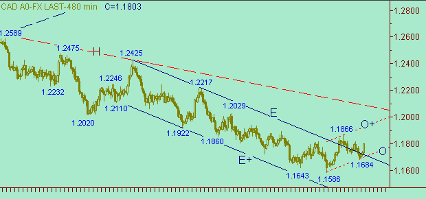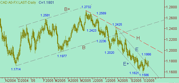 Находимся в up-коррекции (на рис. 3 обозначена каналом O-O+) от снижения курса во второй down-ветки (1.2217(18/08/05)-1.1586(30/09/05)) в движении вдоль линии E на рис. 2. Целевая область для текущего восхождения в рамках коррекции - ценовой интервал 1.1965-1.1975. Промежуточные цели - 1.1860 и 1.1890. Технической защитой уровня 1.1965 служит уровень окончания первой нисходящей ветки в канале E-E+ на рис. 2 - уровень 1.1922. Перспектива перехода коррекции от второй ветки в канале E-E+ в коррекцию от самого изменения курса в этом канале перейдет в реальность в случае или выхода курса выше 1.1922 или в случае затягивания во времени формирования коррекции.