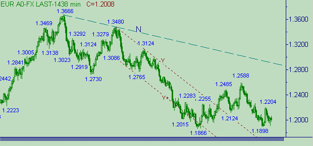 На рис. 3 имеем полноценный нисходящий тренд вдоль линии R. Сейчас евро/доллар делают попытку протестировать уровень 1.2080. Эта область (интервал 1.2070-1.2110) и является важной технической областью.