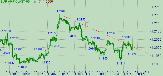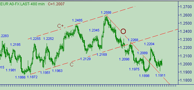 Сейчас трудно отдать предпочтение какой либо ожидаемой модели изменения курса евро/доллара. С одной стороны никто не отменял модели формирования коррекционной формации от снижения курса вдоль линии O на рис. 2. И даже вчерашний минимум, равный 1.1911, почти тюкнул эту линию сверху. С другой стороны - нисходящее движение вдоль линии R на рис. 3 имеем подозрительно пятиволновую структуру, подсказывающего о формировании последующего подобного нисходящего движения. Вот на этом известном вопросе ("вверх или вниз - вот в чем вопрос") на сегодня остановимся.