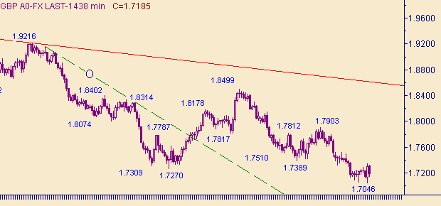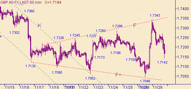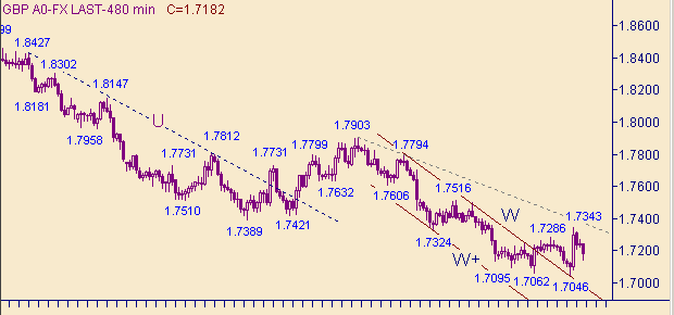 Выход в полупространоство выше 1.7290 состоялся, но закрепиться там фунт/доллару не удалось. В результате имеем самую загадочную фигуру классического технического анализа "расходящийся треугольник" F-F+ на рис. 3 - повышение вершинок и понижение донышек.