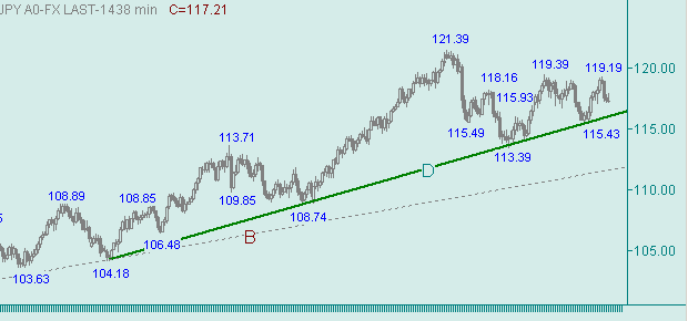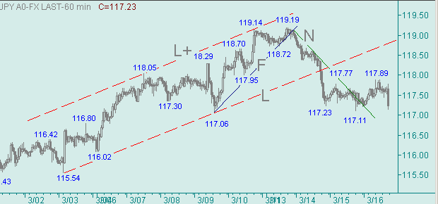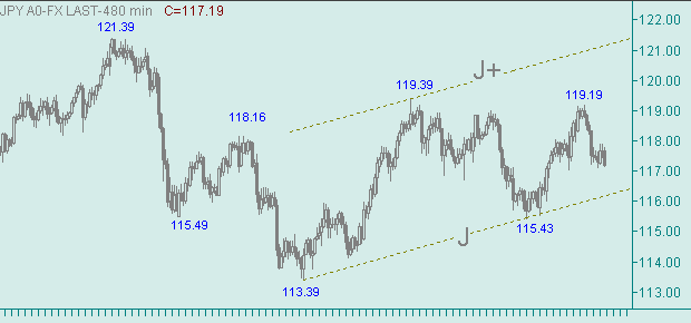 Уже нет сомнений, что рост курса от вчерашнего минимума, равного 117.11 является как минимум коррекцией от снижения вдоль линии N на рис. 3. Сегодняшний максимум, равный 117.89, оттестировал уровень коррекции 61.8% от величины 208п., составляющих длину снижения вдоль линии N на рис. 3.