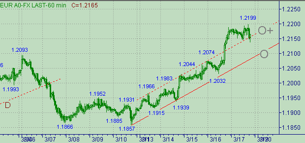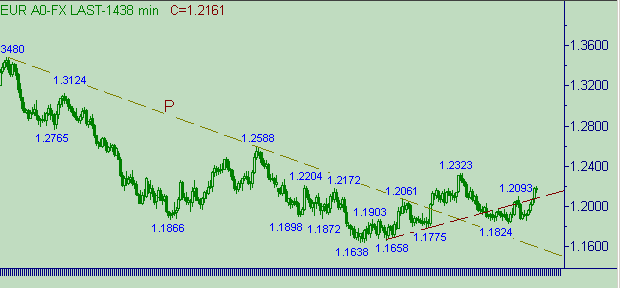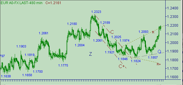 Сейчас рынок формирует коррекцию от восходящего движения от вчерашнего минимума, равного 1.2032, до сегодняшнего максимума, равного 1.2199. Вроде бы надо, но боязно предполагать о возможном качественном переходе этой небольшой коррекции от суточного роста курса в коррекцию от роста курса вдоль линии o на рис. 3. Столько раз предполагали, столько раз рынок обламывал нас. Поэтому и не будем этого делать.