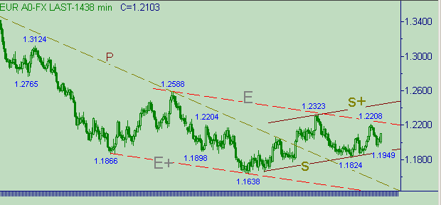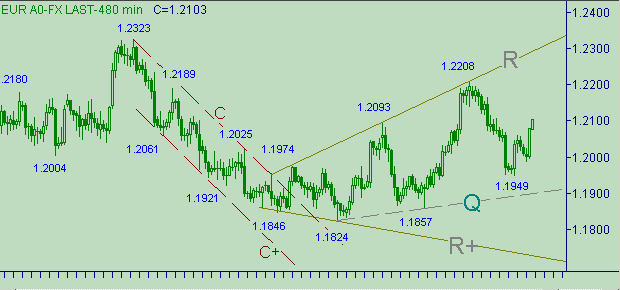 В возможном торговом плане произошли изменения, если открывать от области 1.2100 позицию на продажу, то стоп-лосс необходимо определять выше 1.2140 (другой вариант - усредняться от уровня 1.2130). После раздумий относительно "открытия/неоткрытия" продаж останемся вне рынка. Смущают некоторые детали, например "размытость" целей на up-рост курса (имеем набор следующих уровней: 1.2090, 1.2110, 1.2130, 1.2160).
