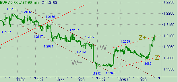 Ещё вчера курс евро/доллар смог опуститься ниже уровня 1.2014, что обозначило нам завершенный вид роста курса 1.1949(24/03/06)-1.2059(27/03/06). Считаем это одним движением длиной 110п. Тогда от сегодняшнего минимума, равного 1.1989, формируется вторая восходящая ветка в up-движении с началом от 1.19499(24/03/06) (на рис. 3 обозначено каналом Z-Z+): первая ветка - 1.1949(24/03/06)-1.2059(27/03/06); вторая от 1.1989(28/03/06). Равенство длин двух веток имеем на уровне 1.2099. уточняем технические целевые уровни для восходящего движения: 1.2100, 1.2165, 1.2205. Сам канал Z-Z+ рассматриваем как часть коррекции от снижения курса в нисходящем канале W-W+ на рис. 3. На данный момент так, а далее посмотрим на перспективы перехода роста курса с началом от 1.1949(24/03/06) в up-движение, в котором канал Z-Z+ будет первым up-движением.