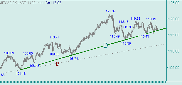 Доллар/Йена сегодня ночью убедительно опустились до целевой области 116.15-116.25. Предполагаем, что от сегодняшнего минимума, равного 116.22 началась коррекция от снижения курса 118.49(24/03/06)-116.22(28/03/06). Целевые области для коррекции: 117.45, 118.00, 118.40. Текущее положение линии W на рис. 3 соответствует значению курса 118.25. А что можем ожидать далее? Далее ожидаем попыток "Медведей" от обозначенных уровней сформировать очередную нисходящую ветку, аналогичную ветки 118.49(24/03/06)-116.22(28/03/06).