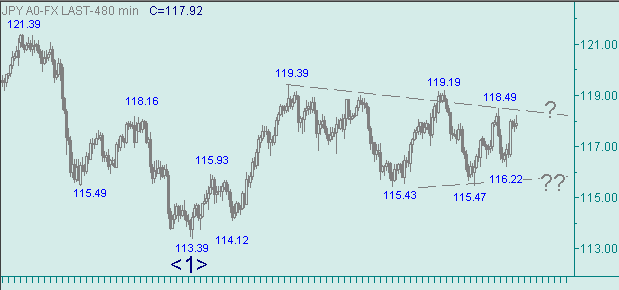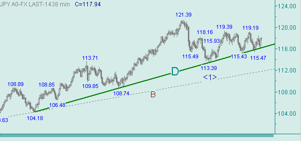 Нам симпатичнее рассматривать формирование от точки <1> на рис. 1 третью восходящую ветку. Рынок пытается up-отбиться от линии D на рис. 1. Технические перспективы понятны: необходимо выйти выше 119.50 и тогда шансы модели "третья ветка в up-движении вдоль линии D на рис. 1" поднимутся в наших умах очень и очень высоко. Но кроме нас все это прекрасно понимают и курс доллар/Йена робко изменяется между уровнем 119.39 и линией D на рис. 1, как хитро-умный политик дрейфующий между Правыми и Левыми.