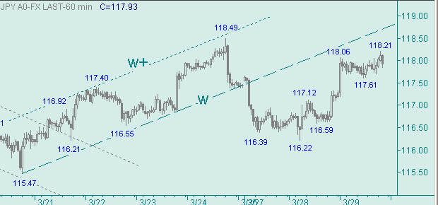 Доллар/Йена приближаются к уровню 118.49, который является окончанием восхождения в канале W-W+ на рис. 3. Для продолжения up-движения технические целевые уровни: 118.75 (кстати, текущее положение линии W на рис. 3 соответствует значению курса 118.68), 119.00, 119.45, 120.60.