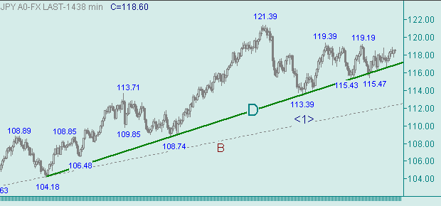 К сожалению, конкретику выложить не можем, т.к. в данный момент могут быть только одни предположения. Направления наших дальнейших мыслей будут следовать за направлением изменения курса: в случае выхода выше 119.00 рассматриваем модель продолжения восходящего движения вдоль линии t на рис. 2, так же как и продолжение восходящего движения с началом от с началом от 113.39(12/01/06) (на рис. 2 обозначен знаком <1>); в случае выхода ниже 117.80 - модель коррекции от восходящего движения вдоль линии t на рис. 2.