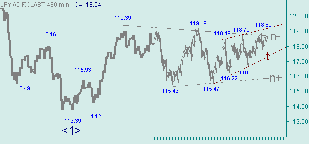Доллар/Йена подозрительно не двигаются вниз, очень даже бодренько продвигаются к области вблизи уровня 119.00 - от вчерашнего минимума, равного 117.80, сформирован восходящий канал r-r+ на рис. 3. Всем эти события происходят выше линии t и ниже линии n на рис. 2.