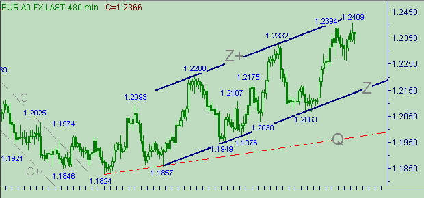 Предполагаем, что идет процесс формирования третей части коррекционной формации от роста курса 1.2066(13/04/06)-1.2394(19/04/06) (третья восходящая ветка в канале Z-Z+ на рис. 2). Целевые уровни самой коррекции: 1.2280, 1.2255, 1.2220, 1.2190. Из рис. 2 и канала Z-Z+ понятна более масштабная перспектива коррекции: переход в коррекцию от самого этого канала. Дале будем предполагать, возможно ли продолжение восходящего движения с началом от 1.1824(27/02/06) (вторая ветка в канале s-s+ на рис. 1). Если это восхождение будет продолжено, то целевые области будем ожидать вблизи 1.2500 и далее.