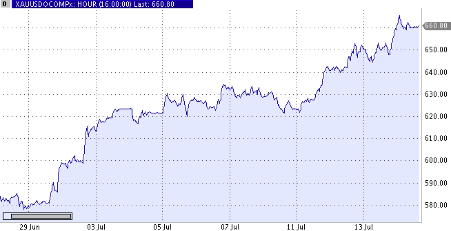 Цены на золото выросли до семинедельного максимума в пятницу из-за рекордных цен на нефть и напряженной ситуации на Ближнем Востоке, но позднее скоррктировались из-за фиксации прибыли. Но дилеры говорят, что спрос остается сильным, поэтому любое падение находит новых покупателей. "Этот комплекс факторов оставляет инвесторов в некотором напряжении, поэтому цены на золото так высоки, чего мы не ожидали", - сказал Тони Добра из Standard Chartered Bank. "Нефть, а за ней и золото, растут на фоне напряженной геополитической ситуации. Мы наблюдали вчера снижение фондовых рынков. Надеемся, что ситуация на Ближнем Востоке нормализуется", - сказал Добра. Фьючерсы на нефть выросли выше $78 за баррель на фоне возобновившихся опасений по поводу поставок из Нигерии и ситуации на Ближнем Востоке. Израиль в пятницу продолжил бомбить Ливан.