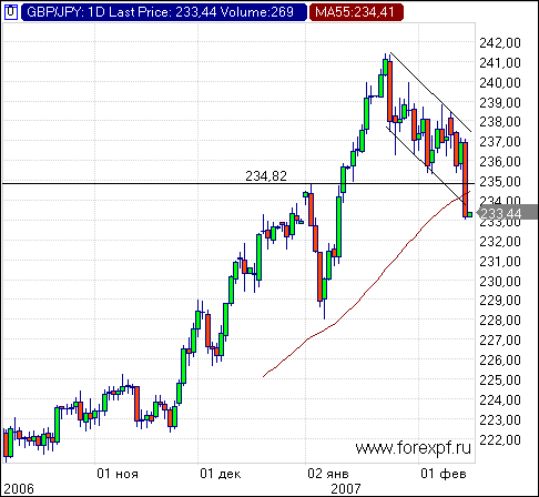 GBP/JPY, реагируя на ослабление британской валюты и укрепление иены, продолжает нисходящее движение, и, пробив поддержку на Y234.82 (максимум 3 января) и линию поддержки с минимума 24 января 2007, упал к минимуму в районе Y233.04. В настоящее время пара торгуется около Y233.47, оставаясь ниже 55-дневной скользящей средней, и, как отмечают в CitiFX, закрытие ниже Y233.94 будет "очень серьезным … учитывая активное участие модельных счетов в ослаблении иены на протяжении последних месяцев". Уверенный прорыв ниже 55-дневной скользящей средней, по словам аналитиков, предполагает движение к 200-дневной скользящей средней, которая в настоящее время находится на Y222.07 ProFinance.Ru - Forex News / Новости Форекс