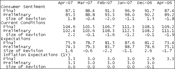 Окончательное значение индекса потребительских настроений Reuters и Мичиганского университета в апреле превзошло прогнозов экономистов в 85.3 пункта, и индекс составил 87.1 пункта по сравнению с 88.4 месяцем ранее. Индекс текущих условий в апреле вырос до 104.6 по сравнению с предварительными 102.4 и 103.5 в марте, тогда как индекс ожидания составил 75.9 против предварительных 74.3 и 78.7 ранее. Однолетние инфляционные ожидания по сравнению с мартом выросли на 0.3% и составили 3.3%. ProFinance.Ru - Forex News / Новости Форекс