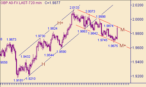 Текущую ситуацию можем определить как неопределенную, так как рост цены 1.9675(21/05/07)-1.9900(23/05/07) очень даже хорошо ложится в оба из перечисленных выше варианта. Приоритетов для постановки позиции у нас сейчас нет. Можно было бы рассмотреть просто работу в канале M-M+, но сегодняшний сработавший стоп-лосс не вдохновляет на это.