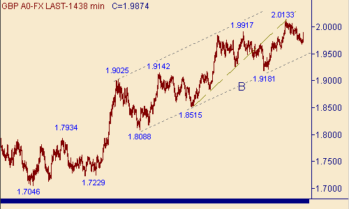 Фунт/доллар продолжает свой подъем от минимума понедельника, равного 1.8675. Этот подъем, переходящий во взлет британской валюты, предполагает окончание её снижения в нисходящем канале M-M+ на рис. 2. В настоящее время линия M на рис. 2 проходит вблизи уровня 1.9891, а сегодняшний промежуточный максимум составил 1.9900. Таким образом, де-факто пара пока так и остается в канале M-M+. Напомним, мы считаем этот канал как коррекцию (или часть коррекции) от роста фунт/доллара 1.9181(05/03/07)-2.0133(18/04/07) (на рис. 2 это канал H-H+). Down-движение фунта в канале M-M+ на рис. 2 составило 48.5% от этого роста пары. И тогда саму коррекцию можно считать состоявшейся. Каковы возможные дальнейшие движения фунт/доллара? Вариантов два. Первый вариант предполагает продолжение down-коррекционной формации с возможным дальнейшим переходом уже непосредственно в down-тренд цены. Второй вариант - попытка продолжить восходящее движение, обозначенное на рис. 3 линией B. Сейчас же пара пытается сформировать коррекцию от сегодняшнего подъема 1.9714-1.9900.