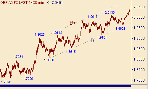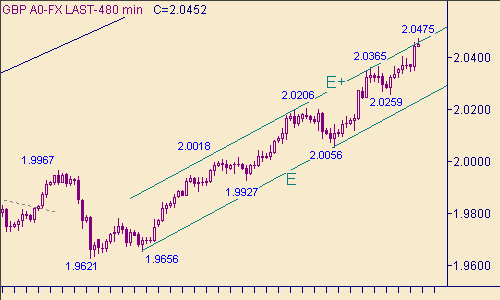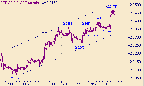 Фунт/доллар продолжает свой рост в рамках восходящего канала F-F+ на рис. 1, который является последней, на текущий момент, up-веткой в канале E-E+ на рис. 2. Сегодняшний промежуточный максимум равен 2.0475. Напомним, что целевые области для up-движения (они же - области сопротивления) находятся между 2.0495/500, 2.0565/70. Область, расположенную вблизи уровня 2.0470, мы рассматриваем, как незначительное сопротивление и поэтому можем ожидать, что фунт/доллар или продолжит свой рост или уже в процессе down-коррекции может "добить" свои технические цели, поднявшись до первой из указанных целевых областей. По сравнению со вчерашним днем сегодняшняя техническая картина более благоприятна для "медведей", которые могут попытаться спровоцировать down-движение британской валюты до ценовой области 2.0200-2.0050. Промежуточные целевые области для down-движения: 2.0400/90, 2.0340/30, 2.0255/50, 2.225/15, 2.0200/90, 2.0150/35. Ближайшим сильным техническим down-сигналом будем считать падение курса ниже фигуры 2.0400, когда как up-сигналом - прорыв цены выше 2.0500.
