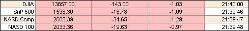 Тем временем, акции Google Inc сегодня достигли минимума в районе $504.10 и в настоящее время торгуются около $521.18 (-5.00%), после того как стало известно о том, что чистая прибыль компании выросла до $925 млн. или $2.93 на акцию (разводненная прибыль на акцию) по сравнению с $721.1 млн. или $2.33 на акцию годом ранее, тогда как аналитики ожидали $3.01 на акцию. Валовая выручка, тем временем, составила $3.87 млрд., при этом процентное отношение затрат к ней выросло до 11% с 9% в предыдущем году. В числе аутсайдеров оказался и Caterpillar Inc., чья прибыль упала сильнее, чем ожидали экономисты, спровоцировав снижение бумаг компании на 7.93% до $80.08, при этом минимум сессии был установлен в районе $78.26. Прибыль компании, работающей в сфере тяжелого машиностроения и производства горнодобывающего оборудования, во втором финансовом квартале упала на 21% до $823 млн. или $1.24 на акцию с $1.05 млрд. или $1.52 годом ранее, в то время как в среднем ожидалось снижение прибыли до $1.49 на акцию. Выручка без учета финансовой деятельности составила $10.61 млрд., также не оправдав прогнозы в $10.34 млрд. Отрицательную динамику сегодня демонстрируют и акции Microsoft Corp. Прибыль компании выросла на 7% благодаря спросу на ПО Office и составила $3.04 млрд. или 31 цент на акцию против (разводненная прибыль), в то время как годом ранее она составляла $2.83% или 28 центов. Данные соответствовали прогнозам экономистов, однако продажи компьютеров принесли меньшие плоды, нежели они ожидали, в результате чего акции компании на NASDAQ в настоящее время торгуются на 1.65% ниже около $30.99. ProFinance.Ru - Forex News / Новости Форекс