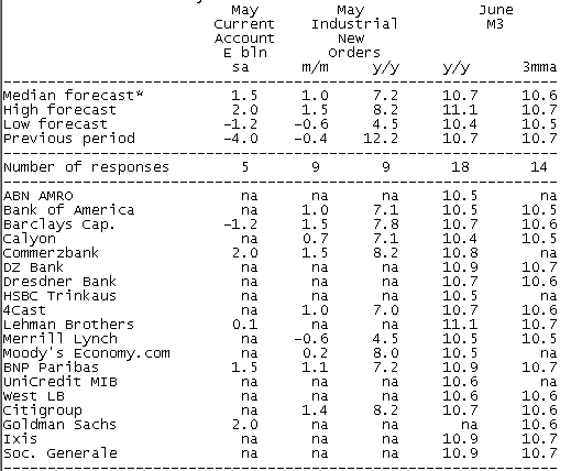 Перевод слева направо: баланс текущего счета за май (млрд. евро), новые промышленные заказы за май, денежная масса М3 за июнь.