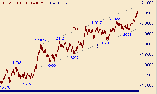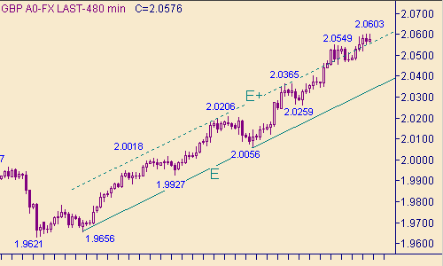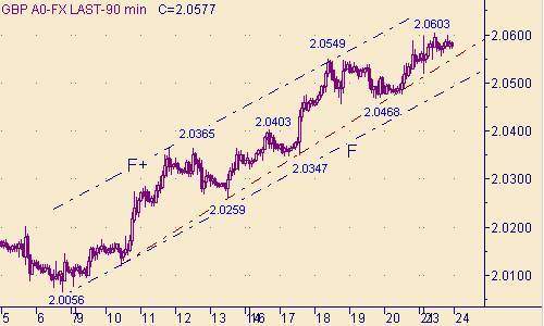 Сегодня фунт/доллар почти отмерил равенство длин двух up-веток в канале F-F+ на рис. 1: первая up-ветка - 1.9656(14/06/07)-2.00206(04/07/07) длина 3051п.; вторая - началась от 2.0056(06/07/07). Равенство длин этих веток наступит в случае касания парой отметки 2.0606, а сегодняшний промежуточный максимум равен 2.0603. Убедительный прорыв курса выше уровня 2.0610 будет предполагать, что восходящий потенциал цены распространяется до уровня 2.0770. Другие возможные целевые области для up-движения расположены в следующей последовательности: 2.0640/45, 2.0660/75, 2.0715/25, 2.0760/70, 2.0790/800. Текущей задачей "медведей" является попытка обозначить окончание восходящего движения фунта в канале F-F+ на рис. 1. Для этого фунт/доллару необходимо опуститься ниже 2.0455. Возможности для снижения курса у "медведей" есть, так как они могут использовать модель технической коррекции от восходящих движений (не будем уточнять от каких). Технические цели для down-модели рассматриваем около уровней 2.0455, 2.0365, 2.0270.