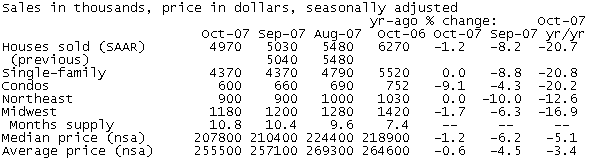 Продажи существующих домов в октябре упали на 1.2% до 4.97 млн., что оказалось хуже среднего прогноза в 5.0 млн. и ниже пересмотренных с 5.04 млн. до 5.03 млн. в сентябре, достигнув минимального уровня с 1999 года. Представители NAR отметили, что снижению способствовал продолжительный эффект кризиса рынка кредитов. Продажи односемейных домов остались на прежнем уровне в 4.37 млн., тогда как продажи многоквартирных домов сократились на 9.1% до 600 000. Изменений в продажах не наблюдалось на северо-востоке и юге США, в то время как на среднем западе продажи упали на 1.7%, а на западе - на 4.4%. Согласно отчету, при текущем уровне продаж, запасы домов будут проданы за 10.8 месяцев, что является рекордным максимумов для этого показателя. Средняя цена дома в октябре упала на 1.2% до $$207 800, в годовом исчислении продемонстрировав снижение на 5.1% г/г. ProFinance.Ru - Forex News / Новости Форекс