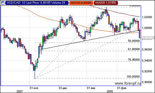 Закрытие ниже линии поддержки с минимумов ноября 2007 года в ходе торгов в понедельник выглядело благоприятным событием для медведей по доллар/канаде, и сегодняшний прорыв ниже 100-дневной скользящей средней стал дополнительным сигналом о наличии потенциала снижения. Между тем, следует отметить, что на дневном графике оформилась "голова и плечи", линия шеи которой поблизости от С$0.9952, сегодня также оказалась пробита. Часовые индикаторы на данный момент выглядят перепроданными, предполагая возможность коррекции, однако дневные указывают на дальнейшего падения. Ближайшей целью медведей являются минимумы декабря в районе C$0.9753, тогда как прорыв ниже подтвердит, что пара находится на дороге к цели "головы и плеч" в районе C$0.9410. Дмитрий Храбров ProFinance.Ru - Forex News / Новости Форекс