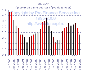 Отчет Национальной статистической службы Великобритании, опубликованный сегодня, показал, что темпы роста ВВП Туманного Альбиона в первом квартале были пересмотрены с +0.4% кв/кв или +2.5% г/г до +0.3% кв/кв или 2.3% г/г, продемонстрировав более сильное замедление, нежели считалось ранее, после +0.6% кв/кв или +2.9% г/г в четвертом квартале 2007 года. Конечное значение показателей разочаровало аналитиков как в части квартальных темпов роста, которые, как предполагалось, должны были остаться на уровне 0.4% кв/кв, так и в части годовых, где ожидался пересмотр до +2.4% г/г. В первом квартале было зафиксировано снижение выпуска в товаропроизводящих отраслях, где оно составило 0.2% кв/кв или +0.4% г/г после роста на 0.2% кв/кв в предыдущем периоде, однако, вместе с тем, производство в обрабатывающей промышленности выросло на 0.4% кв/кв до +0.9% г/г. Производство в горнодобывающей промышленности, тем временем, сократилось на 4.7% кв/кв до -4.9% г/г, тогда как объем выпуска продукции предприятиями, производящими электроэнергию, газ и воду, сократился на 1.3% кв/кв до +1.4% г/г. В строительном секторе, между тем, наблюдалось некоторое замедление: рост производства составил 0.4% кв/кв до +2.4% г/г после +0.9% кв/кв в предыдущем квартале, а в секторе услуг рост составил 0.3% кв/кв после +0.6% кв/кв в предыдущем квартале, при этом годовые темпы роста замедлились с 3.4% г/г до +2.6% г/г, отражая ослабление во всех основных подсекторах.