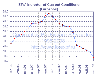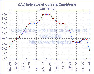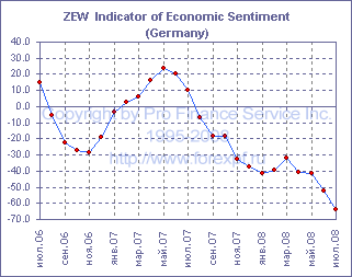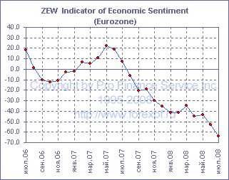 Отчет ZEW, опубликованный сегодня, стал весьма неприятным сюрпризом для участников рынка, принимая во внимание его ярко выраженный негативный характер, сигнализирующий о существенном ухудшении деловой активности как в Германии, так и в целом в Еврозоне. Индекс экономических настроений в Германии в июле упал до -63.9 пункта после -52.4 в июне, что оказалось заметно хуже среднего прогноза аналитиков в -57.0 пункта, при этом индекс экономических ожиданий продемонстрировал еще более ощутимое падение и составил 17.0 пункта, что оказалось почти в два раза хуже, чем средних прогноз, предполагавший снижение показателя до 32.0 пункта после 37.0 в июне. Согласно отчету, столь серьезное ухудшение индикаторов в июле было обусловлено ростом рисков для экономической активности по всему миру, а также высокими ценами на нефть, сильным евро и продолжающимся кризисом в США. Кроме того, ожидается, что повышение ставки ЕЦБ и ослабление внутреннего потребительского спроса также негативно скажется на немецких компаниях в ближайшие полгода. Тем временем, индекс экономических настроений в Еврозоне упал с 7.9 до -3.3 пункта, а индекс экономических ожиданий потерял 11 пунктов и составил 63.7 пункта. Источник: ProFinance.Ru - Новости рынка Форекс