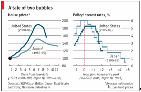 В условиях падения цен на жилье и усиления кризиса кредитования возникают опасения, что экономика США может войти в период десятилетней стагнации, как Япония после разрыва пузыря в начале 1990-х. Причинами пузыря на рынке недвижимости Японии были дешевые деньги и финансовая либерализация. Кроме того, большинство людей думало, что цены на недвижимость не упадут по всей стране. Поэтому, когда это случилось, заемщики перестали погашать обязательства, а банки перестали выдавать кредиты. В результате на протяжении последующих десяти лет средние темпы роста не превышали 1%. Многие гонят от себя мысль о том, что Америку может постигнуть участь Японии, находя между двумя странами следующие отличия. Во-первых, как утверждают некоторые, пузырь в Японии был намного больше, чем сейчас в Америке. Однако в период с 2000 по 2006 гг. средние цены на жилье по Америке поднялись на 90%, а в Японии с 1985 года по начало 1991 года, когда цены достигли своего пика, рост составил всего 51% (см. график слева). Цены в крупных японских городах росли быстрее, однако при оценке воздействия на экономику страны следует опираться на общенациональные данные. За этот период цены на жилье в Японии упали почти на 40%. В США они уже понизились на 20%, и многие экономисты прогнозируют продолжение падения еще на 10% и более.С коммерческой недвижимостью дела обстоят не лучше. За одинаковый период времени цены в Японии поднялись в среднем менее чем на 80%, в то время как в Америке рост составил 90%. Таким образом, получается, что бум недвижимости в Японии был меньше, чем в Америке. Кроме того, в Японии за год до разрыва пузыря на рынке недвижимости лопнул другой пузырь - на фондовом рынке . Он нанес большой вред банкам, часть капитала которых находилась в акциях других фирм. Домохозяйства пострадали не так сильно, поскольку только 30% населения владели акциями, в то время как в Америке акционерами является больше половины жителей. Вопреки расхожему мнению, японские политики снизили процентные ставки и ослабили финансовую политику так же быстро, как и в Америке. Банк Японии начал понижать процентные ставки в июле 1991 года, вскоре после начала падения цен на недвижимость. К концу 1993 года дисконтная ставка была сокращена с 6% до 1.75%. Через два года после того, как цены на жилье в Америке начали понижаться, ставка по федеральным фондам упала с 5.25% до 2% (см. график справа). Исследование Федеральной резервной системы США показало, что процентные ставки в1991 году в Японии упали гораздо более резко, чем того требует "правило Тейлора", по которому подходящая ставка устанавливается на основе размера резервных мощностей и инфляции.