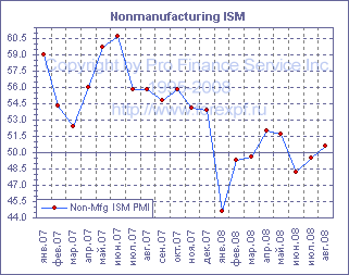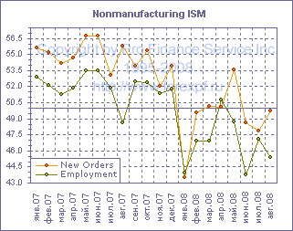 Сегодняшний отчет ISM показал, что в августе в секторе услуг после двух месяцев отрицательной динамики был зафиксирован рост, который наблюдался в 10 секторах: секторе недвижимости, в секторе аренды и лизинга, горнодобывающем секторе, секторе здравоохранения и социальной поддержки, секторе услуг образования, коммунальных услуг и агропромышленном секторе. Кроме того, увеличение деловой активности было отмечено в лесном и рыбном хозяйствах, строительстве, а также в области профессиональных, научных и технических услуг. Сокращение деловой активности, тем временем, было зафиксировано в восьми секторах: секторе транспортных услуг и услуг хранения, финансовых и страховых услуг, услуг отелей и ресторанных услуг, в оптовой торговле, секторе развлечений и отдыха, а также в секторе услуг управления, розничной торговле и секторе услуг государственного управления. Согласно отчету, композитный индекс ISM в августе составил 50.6 пункта, что выше среднего прогноза аналитиков (прим. ProFinance.ru: 49.5), при этом индекс деловой активности поднялся с 49.6 до 51.6 пункта, индекс новых заказов вырос с 47.9 до 49.7 пункта, а индекс доставок поднялся с 53.5 до 55.5 пункта. Индекс занятости, между тем, составил 45.4 после 47.1 пункта в июле, индекс запасов снизился с 54.5 до 53.5 пункта, а индекс импорта снизился с 49.0 до 46.0 пункта. Индекс невыполненных заказов в августе упал с 52.0 до 49.0 пункта, а индекс новых экспортных заказов упал с 47.5 до 44.5 пункта. Индекс цен просигнализировал о дальнейшем ослаблении ценовых давлений (72.9 пункта после 80.8 в июле и 84.5 в июне), однако он остается на весьма высоком уровне. Источник: ProFinance.Ru - Новости рынка Форекс