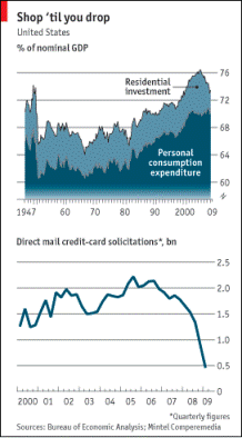 Финансовые инновации тоже сыграли свою роль, т.к. в отрасли изобретались все новые способы получения кредита под залог недвижимости. Одним из их проявлений было изобилие предложений по кредитным картам даже маржинальным заемщикам: по данным Mintel Comperemedia, проводящей исследования потребительского рынка, в 2006 г. в почтовые ящики американцев было брошено более 8 млрд. карт. С начала 2003 г. по 2006 г. потребители набрали кредитов почти на $2 трлн под залог своего имущества и путем рефинансирования ипотечных кредитов. Грядет резкий разворот. В прошлом году состояние домохозяйств снизилось на 18%, или на $11 трлн. По ожиданиям компании Macroeconomic Advisers, такое снижение состояния в этом году приведет к сокращению потребления на 2%. Финансовый кризис уничтожил многие из кредитных продуктов, которые расширяли доступ к кредитам в годы подъема. Субстандартное ипотечное кредитование исчезло, а к рефинансированию, с помощью которого домовладельцы получали наличные, теперь предъявляются более строгие андеррайтинговые стандарты и повышенные требования. В первом квартале производители кредитных карт разослали лишь четвертую часть всех предложений, сделанных в прошлом году (см. нижний график выше).