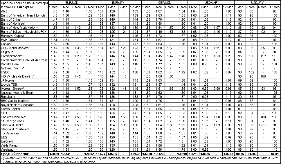 Мы обновили сводную таблицу прогнозов от крупнейших банков мира. В таблице, которая представлена ниже, все прогнозы остаются актуальными по состоянию на 26 октября 2009 года. Как и прежде мы будем регулярно публиковать сводные данные с учетом возможных пересмотров прогнозов к моменту каждой новой публикации сводной таблицы. Мы сохраняем за собой единоличное право в составлении списка финансовых институтов, включенных в сводную таблицу. Мы будем стараться отдавать приоритет таким банкам и инвестиционным домам, репутация, профессионализм и экспертный уровень которых не вызывают сомнений в мировом финансовом сообществе. Дмитрий Храбров Источник: ProFinance.Ru - Новости рынка Форекс