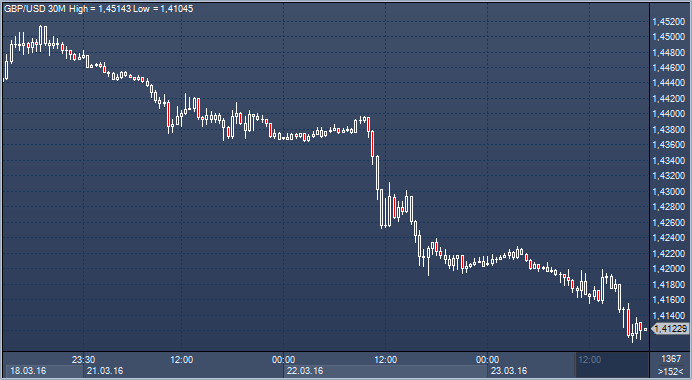 Стерлинг держится на уровне $1.4122, на нижней стороне сегодняшнего разброса цен от $1.4105 до $1.4227. Как сообщает ITV, последние опросы показывают, что число тех, кто выступает за выход Британии из ЕС, составляет 41%, а число тех, кто хочет сохранения ее членства в блоке - 48%, но число тех, кто хочет остаться в ЕС — минимальное за все время опросов с тех пор, как они стали проводиться, то есть с мая 2015 года (когда результат был 34% "выйти" и 56% "остаться"). 11% респондентов выражают нерешительность в данном вопросе в настоящее время.
