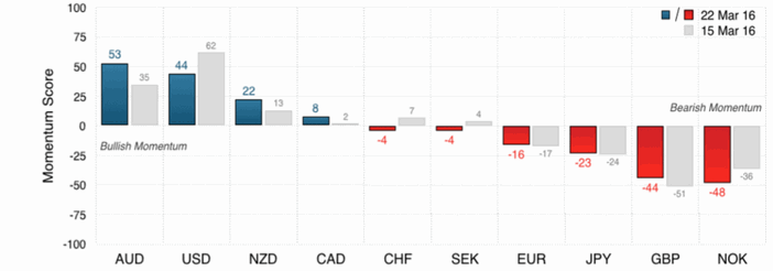 Валютные стратеги BNP Paribas обновили еженедельно публикуемую оценку текущей ситуации на валютном рынке, сгенерированную системой FX Momentum. Как следует из ее названия, система оценивает силу валютных трендов, исходя из текущей динамики валютных курсов (FX Momentum), ставок (Momentum Rates) и поведения фондового рынка (Equity Momentum). Сила тренда основных валют оценивается по совокупности компонентов по шкале от -100 (сильнейший медвежий моментум) до +100 (сильнейший бычий моментум).
