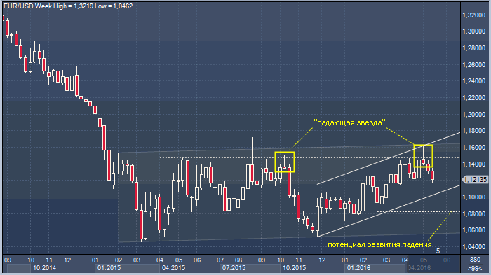 Техническая картина на недельном графике валютной пары евро/доллар отражает наличие риска продолжения развития нисходящей динамики. На графике, представленном ниже, отмечена «падающая звезда» в октябре 2015 года. Ее реализация на 7 неделю привела к формированию минимумов в области 1.0520. На позапрошлой неделе мы также наблюдаем «падающую звезду», которая в качестве реальной цели определяет падение к 1.0820. При этом дальнейшее развитие нисходящей динамики не может быть исключено. Цены имеют возможность войти в диапазон между 1.0710 и 1.0580. Надежда быков по евро связана с поддержкой, которую представляет собой нижняя линия текущего восходящего канала (белые линии на графике). Источник: ProFinance.Ru - Новости рынка Forex