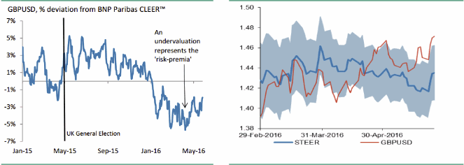 Наша модель оценки справедливой стоимости курса в среднесрочном горизонте (CLEER) показывает, что премия за риск, ранее присутствовавшая в фунте, устранена частично. Но не полностью. Большую часть первого квартала 2016 года уровень недооцененности фунта (та самая премия за риск) составлял 5%. К настоящему моменту премия за риск сократилась только на 2%.