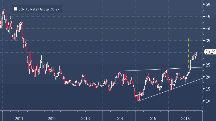 Видимо с учетом данной информации аналитики Альфа-Банка приняли решение повысить прогнозную цену GDR (депозитарные расписки в Лондоне) X5 Retail Group с 31.3 до 35 долларов за штуку. Ранее эксперты банка выставляли рекомендацию «покупать» для данных GDR, и она, естественно, была подтверждена в сегодняшнем обзоре.