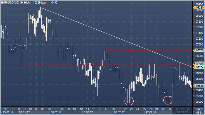 До тех пор, пока евро/доллар остается ниже краткосрочной вершины даунтренда ($1.0631), медведи продолжат контролировать ситуацию. Теперь трейдерам следует сместить фокус внимания на минимумы прошлой недели чуть ниже $1.05, прорыв которых откроет дорогу для дальнейшего снижения к январским минимумам около $1.0352-40.