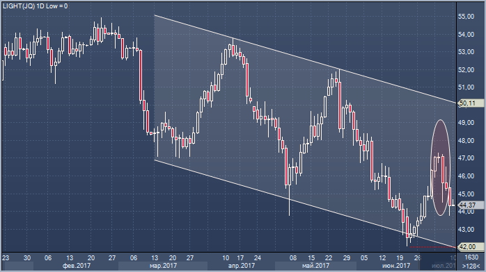 В середине прошлой недели фьючерсы на нефть WTI сформировали ключевую разворотную фигуру: с 21 июня цены постоянно росли, достигая все новых максимумов, однако затем резко развернулись, закрывшись ниже минимумов предыдущей сессии. Запасы нефти и нефтепродуктов в США снизились, что является очевидным бычьим фактором, и нефть первоначально отреагировала ростом. Однако затем все те же привычные медвежьи соображения (рост добычи в США, Ливии и Нигерии, не связанных обязательствами в рамках соглашения ОПЕК+) перевесили весь позитив, и черное золото возобновило падение.
